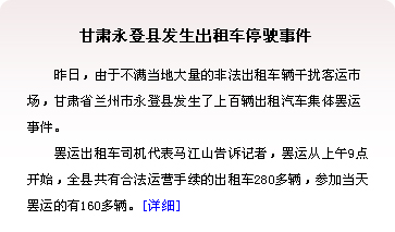 | 7月29日起,一次出租車(chē)司機(jī)集體停運(yùn)的事件在這個(gè)城市發(fā)生,為期約4天。7月30日一天,就有7列火車(chē)的旅客大量滯留在銀川火車(chē)站。[詳情] | |