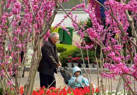 一位推著童車的老人從一片紫荊花前經(jīng)過。新華社記者:王頌