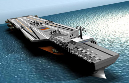 | 網友設計的中國海軍航母想象圖。 | 【中央軍委委員、海軍司令員吳勝利上將日前在接受新華網采訪時透露,中國海軍將研制新一代艦艇飛機。要進一步加大裝備的現(xiàn)代技術含量,必須加快推進重點武器裝備建設步伐,研制大型水面戰(zhàn)斗艦艇等新一代武器裝備。此前,中國國防部長梁光烈2009年3月20日與到訪的日本防衛(wèi)大臣濱田靖一會談時表示,中國是唯一沒有航母的大國,中國不可能永遠不擁有航母。這樣的表態(tài)被海外媒體解讀成是中國政府首次公開宣布航母建造計劃。據有關專家估算,如果中國建造一艘自用的航空母艦,并為其配備完整的戰(zhàn)斗編隊,恐將花費上百億元。在當前這個國際經濟不振、國內經濟面臨考驗的時候,上百億元的采購大單,毫無疑問會對中國經濟起到助推和加速作用!