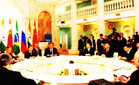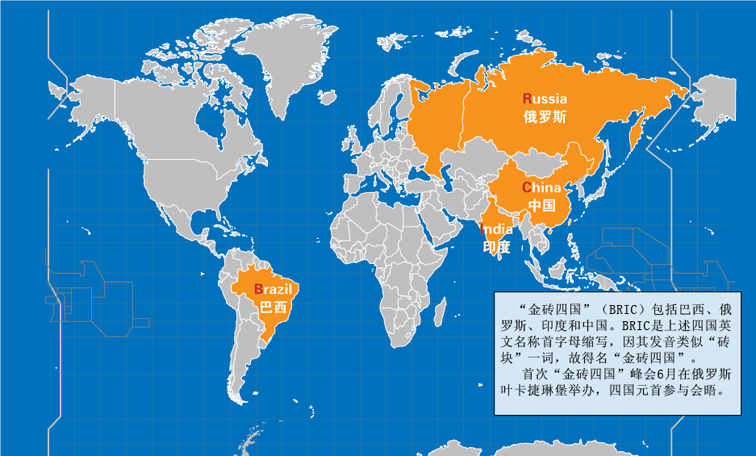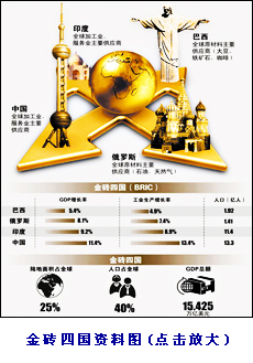 | 從高盛公司在2003年10月提出“金磚四國”概念,5年多后,“金磚”終于從一個學術和新聞概念,上升為外交詞匯。俄羅斯政治基金會主席尼科諾夫預言,這個夏天之后,“金磚四國”將成為一個“具有超強影響力的、決定21世紀面貌的機構”。[詳細] | |