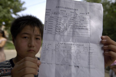 “我娃才22個月,血鉛含量這么高,你說咋能不讓人害怕?”8月11日,陜西省鳳翔縣孫家南頭村村民李永鋒憂心忡忡地告訴記者。李永鋒的兒子李庚秋8月3日在寶雞市中心醫(yī)院所做的血樣微量元素檢測報告單顯示:血鉛含量是180ug/l(微克每升),高于100ug/l以內(nèi)的正常標(biāo)準(zhǔn)。