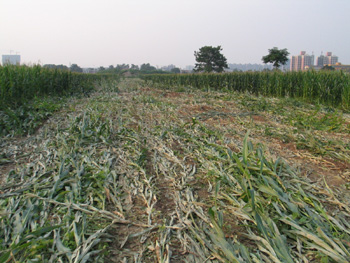 科收來臨之際,西安市郭杜鎮(zhèn)郭南村的數(shù)百畝玉米田日前遭到不明大型車輛“橫沖直撞”,百余畝即將成熟的玉米被碾毀。郭杜鎮(zhèn)因毗鄰某開發(fā)區(qū),近年來因農(nóng)村土地征用問題引發(fā)糾紛。本報記者馮國