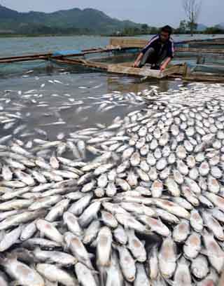 3月29日,一名為養(yǎng)殖戶龍鳳瓊養(yǎng)魚的農(nóng)民在清理死魚。龍鳳瓊所養(yǎng)的魚目前已死亡近4萬公斤。