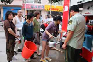 7月28日,內(nèi)蒙古赤峰市新城區(qū)居民排隊在消防車旁接飲用水。