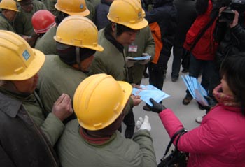 石家莊市職工法律援助團(tuán)工作人員為農(nóng)民工現(xiàn)場(chǎng)發(fā)放維權(quán)宣傳資料。新華社記者 曹國(guó)廠