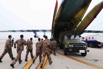北京南苑機場,救援人員準備登上大型運輸機。新華社發(fā)(沈玲 攝) |