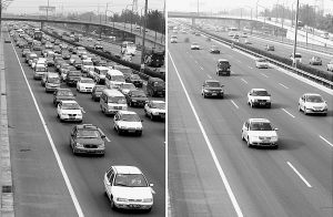 北京:單雙號車輛上路試運行,交通狀況有所改善。圖為北京東四環(huán)小武基橋區(qū)的車流。左圖攝于8月16日8時24分,右圖攝于8月17日8時17分。卓恩森攝 |