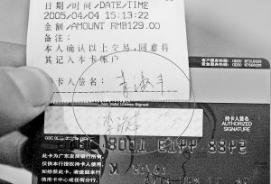 2005年4月,鄭州一消費(fèi)者李女士丟失的兩張信用卡,被人拾去后,在1小時(shí)之內(nèi)刷掉4萬多元。李女士在用另一張廣發(fā)信用卡做測(cè)試中發(fā)現(xiàn),刷卡時(shí)的簽名明顯不符,但依然消費(fèi)成功。(資料圖片)小曉攝 | 簽名信用卡被盜刷
