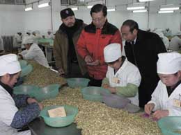 | 美國(guó)蒙特利公園市副市長(zhǎng)劉達(dá)強(qiáng)參觀慶陽(yáng)隴東集團(tuán)的白瓜子加工車(chē)間。 |