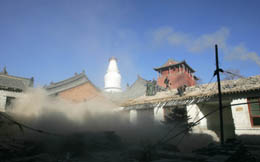 1月11日,在山西省忻州市五臺(tái)山景區(qū),工人們在五臺(tái)山大白塔下拆除房屋。為保護(hù)中國四大佛教圣地之一五臺(tái)山的“佛國”氛圍,中國已啟動(dòng)一項(xiàng)大規(guī)模的拆遷工程,使?jié)庵氐纳虡I(yè)氣息從五臺(tái)山逐漸淡出,同時(shí)也為申報(bào)2008年世界自然和文化“雙遺產(chǎn)”做好準(zhǔn)備。五臺(tái)山位于中國山西省的北部,梵宮琳宇構(gòu)成了東亞乃至世界現(xiàn)存最龐大的佛教古建群,僅五臺(tái)內(nèi)現(xiàn)存完好的寺院就有47座,為中國最早、最大的國際性佛教道場。 |