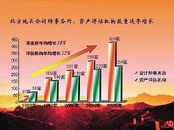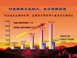 北京注協(xié)以高度的責(zé)任感和使命感,以科學(xué)的管理意識(shí)和誠(chéng)信務(wù)實(shí)的工作作風(fēng),引領(lǐng)北京注冊(cè)會(huì)計(jì)師、注冊(cè)資產(chǎn)評(píng)估師行業(yè)朝著良性發(fā)展的方向發(fā)展,行業(yè)規(guī)模得以迅速壯大,位居全國(guó)行業(yè)領(lǐng)先地位。截至2006年底,北京注協(xié)共有會(huì)計(jì)師事務(wù)所428家,注冊(cè)會(huì)計(jì)師10799人,分別比上年增長(zhǎng)15%和8%;資產(chǎn)評(píng)估機(jī)構(gòu)254家,注冊(cè)資產(chǎn)評(píng)估師2938人,分別比上年增長(zhǎng)9%和6%;2005年度行業(yè)收入合計(jì)44.6億元,其中會(huì)計(jì)師事務(wù)所業(yè)務(wù)收入39.7億元,資產(chǎn)評(píng)估機(jī)構(gòu)業(yè)務(wù)收入4.9億元,比上年增長(zhǎng)21%。在中國(guó)注冊(cè)會(huì)計(jì)師協(xié)會(huì)公布的2006年全國(guó)會(huì)計(jì)師事務(wù)所業(yè)務(wù)收入排名“百?gòu)?qiáng)”中,北京地區(qū)占據(jù)42家,其中7家進(jìn)入前10名。自2000年以來,業(yè)務(wù)收入連續(xù)位居全國(guó)前列,各種特種執(zhí)業(yè)資格亦獨(dú)占鰲頭。