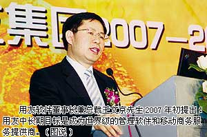 來自權(quán)威市場調(diào)研機構(gòu)數(shù)據(jù)顯示,用友軟件已連續(xù)五年超越國際廠商成為中國企業(yè)管理軟件/ERP市場的領導者,徹底改變了中國和亞太企業(yè)管理軟件/ERP市場的格局。2007年2月用友集團發(fā)布新三年規(guī)劃,明確把“管理軟件”和“移動商務”作為公司下一個發(fā)展階段的兩大核心業(yè)務,并將成為“世界級的管理軟件和移動商務服務提供商”作為公司中長期發(fā)展目標。用友集團計劃戰(zhàn)略加強管理軟件業(yè)務的發(fā)展,目標是要成為亞洲最大,世界前五;計劃戰(zhàn)略培植移動商務業(yè)務,目標是要成為中國最大,世界第一。這是一個宏偉的目標,市場再次將目光聚焦于用友身上。