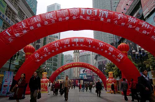 3月19日,重慶最大商業(yè)區(qū)解放碑的廣告彩虹。2007年春季全國(guó)糖酒會(huì)將于23至25日在重慶舉行,鋪天蓋地的廣告近日已將重慶不少重點(diǎn)路段包圍。據(jù)不完全統(tǒng)計(jì),本屆糖酒會(huì)發(fā)布噴繪布幅、廣告牌、看牌、大型過(guò)街門(mén)樓、特裝造型等各種廣告面積將達(dá)5萬(wàn)平方米左右。