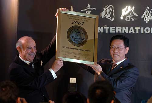 4月1日,北京國際飯店總經(jīng)理陳旭華(右)接受美國優(yōu)質(zhì)服務(wù)科學(xué)學(xué)會主席約瑟夫·欽奎頒發(fā)的“國際五星鉆石獎”獎牌。當日,北京國際飯店榮獲“國際五星鉆石獎”頒獎晚會在北京舉行!皣H五星鉆石獎”是由美國優(yōu)質(zhì)服務(wù)科學(xué)學(xué)會頒發(fā)的國際服務(wù)業(yè)最高優(yōu)質(zhì)服務(wù)獎,是國際公認的最具權(quán)威的全球服務(wù)領(lǐng)域最高獎項。