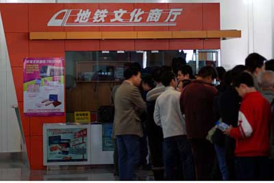 10月7日,北京地鐵5號線正式開通,車票、郵票、紀念章等相關(guān)紀念品也開始發(fā)售。許多銷售點前排起長隊,“北京地鐵線路建設紀念章”等紀念品很快便被搶購一空。圖為收藏愛好者在北京西直門地鐵站文化商廳前排隊等待購買北京地鐵5號線開通系列紀念品。