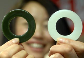 | 工作人員展示將作為2008年奧運(yùn)會(huì)獎(jiǎng)牌所用玉料的樣品(左為青玉、右為白玉)。本報(bào)資料照片 | 美玉收藏行情看漲