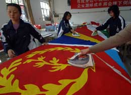 10月29日,北京市京工紅旗廠的職工在熨燙參會非洲國家的國旗。為迎接即將在北京召開的“中非合作論壇北京峰會”,北京市京工紅旗廠的職工夜以繼日努力工作。