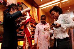連日來,參加中非合作論壇的非洲代表利用會(huì)議間隙,開始近距離地接觸古老的中國文化,尤其對中國細(xì)膩精致的絲綢、瓷器制品愛不釋手。圖為兩位與會(huì)代表正在北京飯店絲綢商店挑選絲綢制品。