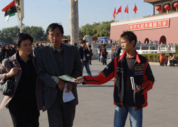 10月31日,一名青年(右一)在天安門城樓前向行人散發(fā)小廣告。當(dāng)日,提請北京市人大常委會(huì)審議的《北京市市容環(huán)境衛(wèi)生條例修正案(草案)》加大了對“小廣告”直接受益人的處罰額度,企業(yè)或者其它單位擅自利用或者組織張貼、涂寫、刻畫、噴涂、散發(fā)標(biāo)語、宣傳品和廣告進(jìn)行宣傳的,除沒收非法財(cái)物和違法所得外,“處1萬元以上10萬元以下罰款;情節(jié)嚴(yán)重的,處10萬元以上50萬元以下罰款”。