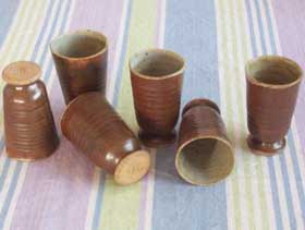 那天,我又逛到了那個基督教二手店,一下子就在一堆器皿中發(fā)現(xiàn)了幾個樣式奇特的小杯子。它們的外表是深褐色的,有很明顯的一圈一圈的紋路,拿在手上感覺一點也不滑手。杯子的里面是雞蛋清色,還有麻麻點點的點綴。最有特點的是它們的形狀和底座,瘦長條型的,和一般的西洋杯子的形狀不一樣。尤其是底座,有特意加強的效果,使杯子的重心下移,雖然細長但很穩(wěn)當。這樣纖細修長的杯子顯然是東方風格的,只有東方人的縝密才能構(gòu)思出這樣的粗中有細的作品來。在每個杯子的底座下,還有一個方形的印章,看不清是什么字,但很顯然,它們曾經(jīng)是作者的珍愛。