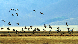 三江并流世界自然遺產(chǎn)地,位于云南省西北部橫斷山脈的金沙江、瀾滄江和怒江流域的特定自然地理區(qū)域,是世界上罕見的集地質(zhì)地貌多樣性、動(dòng)植物多樣性、景觀多樣性及民族文化多樣性于一體的高山峽谷自然區(qū)域。為保護(hù)當(dāng)?shù)厣鷳B(tài)環(huán)境,云南省先后劃定了白馬雪山、玉龍雪山等10余個(gè)國(guó)家和省級(jí)自然保護(hù)區(qū),并投入巨資實(shí)施天然林保護(hù)工程和水土保持工程。目前,這一區(qū)域林草豐茂,美景如畫。圖為鳥類在云南省迪慶藏族自治州香格里拉縣境內(nèi)的納帕海自然保護(hù)區(qū)內(nèi)飛翔。 |