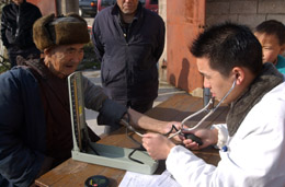 12月2日,鳳陽縣總鋪鎮(zhèn)小石塘村的李家珍老人(左)在接受免費(fèi)體檢。 為體現(xiàn)新型農(nóng)村合作醫(yī)療制度的優(yōu)越性,11月23日至12月23日,鳳陽縣農(nóng)村合作醫(yī)療管理中心給全縣26個(gè)鄉(xiāng)鎮(zhèn)的農(nóng)民送去免費(fèi)體檢的服務(wù)。全縣2006年度未享受到合作醫(yī)療任何補(bǔ)償?shù)霓r(nóng)戶家庭可出一人參加免費(fèi)體檢。