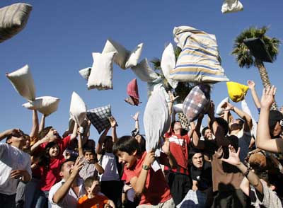 日前,在智利首都圣地亞哥西北約137公里的比尼亞德爾馬,人們以枕頭作為“武器”,進行激烈的枕頭“大戰(zhàn)”。