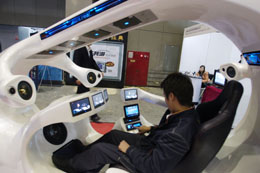 參觀者在模擬 車中體驗(yàn)汽車影音新品 |
