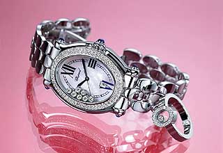 Diamonds)”。在表盤上,活動的鉆石在兩塊透明的藍寶石水晶之間可以完全自由地滑動和轉動。隨著手腕的動作,鉆石不停地游走,閃爍出星星點點的誘人光芒。蕭邦表“快樂鉆石”系列被視為風格獨特的表中極品,它改變了寶石僅能靜態(tài)鑲于表面的設計,贏得了1976年德國巴登巴登金玫瑰獎。自此,蕭邦公司躋身國際頂級豪華表制造商之列。