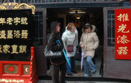 2007年春節(jié)期間,世界文化遺產(chǎn)地平遙古城推出“中國(guó)年”系列活動(dòng),吸引了大量外國(guó)游客前來(lái)感受晉商故里,體驗(yàn)中國(guó)春節(jié)。圖為一家專營(yíng)漆器(當(dāng)?shù)匾环N手工藝)的店鋪吸引了外國(guó)游客駐足。