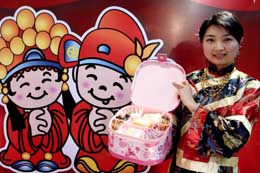 圖為一位工作人員在展示特色鮮明的婚禮點心盒,據(jù)悉新式結(jié)婚用品近期頗受歡迎。