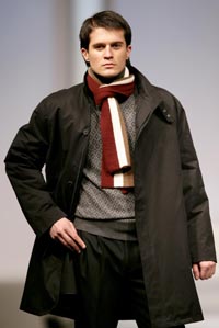 “世界風(fēng)”在意大利設(shè)計(jì)界的風(fēng)靡使得本季秋冬男裝中融合了多國(guó)元素:極具英倫特質(zhì)的方格圍巾,襯托出男性?xún)?yōu)雅的面孔;大翻領(lǐng)雙排扣的古典韻味的風(fēng)衣配以高領(lǐng)針織衫,盡顯男性的智慧和優(yōu)雅;大口袋的西部特色的短款上衣配以休閑長(zhǎng)褲,使得男性在成熟中略帶一點(diǎn)慵懶。 男裝的面料也呈現(xiàn)多元化和大膽化。精致的精紡羊毛面料套裝,修身剪裁,合體精練。而經(jīng)典的格子面料也不可或缺,加上挺括的精紡羊絨,色澤柔和手感柔軟的山羊皮的運(yùn)用,更提升服裝的價(jià)值感。更有大膽者將絲絨面料大幅用來(lái)做西服上裝,給人以新鮮的沖擊感。另外,不同材質(zhì)和顏色的大面積的拼接和混搭也是本季的一大亮點(diǎn)。