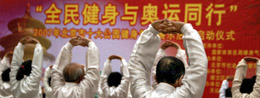 2007年北京十大公園健身氣功展示活動(dòng)啟動(dòng)儀式18日在北京天壇公園舉行。來自各界的400多名氣功愛好者演練了易筋經(jīng)、五禽戲、六字訣和八段錦等四種健身氣功。