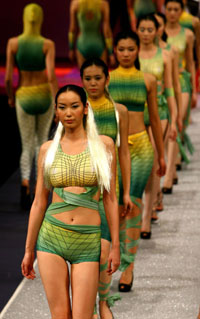 黑色高領(lǐng)的上裝,白底細(xì)黑邊組成雙腰的短褲,微微露臍,加上美麗的腰帶,凸顯了模特兒高挑傲人的身段,黑白兩色相間別具一格,表現(xiàn)了時(shí)尚動(dòng)感的一面。天藍(lán)色的內(nèi)衣也別具匠心,將抹胸與短褲用細(xì)細(xì)背帶連接起來簡單地系在脖頸上,且在背帶上點(diǎn)綴了一些藍(lán)綠色的裝飾花,使女性看起來嫵媚脫俗,清麗動(dòng)人。帶有中國傳統(tǒng)特色的紅色系的內(nèi)衣一出場就吸引了觀眾的眼球,紅色的頸帶在同色的抹胸前交叉,后又輕松地系于頸后,紅白相間的雙腰短褲美觀大方,使整套內(nèi)衣顯得簡單又具有濃郁的民族特色。 |