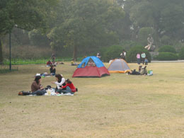 在孤山腳下魯迅像前的帳篷搭設(shè)區(qū)。 |