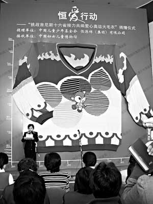 3月27日,在北京2008年奧運會開幕式倒計時500天之際,由恒源祥(集團(tuán))有限公司和中國兒童少年基金會聯(lián)合主辦的“恒愛心奧運情——挑戰(zhàn)吉尼斯16省接力共編愛心大毛衣”活動在全國婦聯(lián)大樓舉行了捐贈儀式,與會者見證了世界最大純手工編織羊毛衫的誕生。