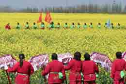 第三屆中國(guó)·河橫菜花節(jié)日前在江蘇姜堰沈高鎮(zhèn)河橫村開(kāi)幕,吸引了眾多游人。河橫村是全國(guó)農(nóng)業(yè)旅游示范點(diǎn),曾被聯(lián)合國(guó)環(huán)境規(guī)劃署授予生態(tài)環(huán)境“全球500佳”稱號(hào)。圖為河橫村的農(nóng)民腰鼓隊(duì)走在油菜田里。 |