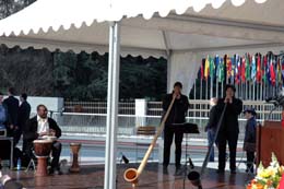 瑞士日內瓦萬國宮廣場新廣場落成典禮上,人們通過踩高蹺和吹長號等方式舉行慶;顒印1緢笥浾:劉國遠 攝