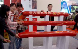 4月27日,幾位參觀者在好奇的觀看幾根超大火腿腸。正在河南鄭州舉辦的第二屆中國(guó)中部投資貿(mào)易博覽會(huì)上,一家食品加工企業(yè)特別制作了三根各重50公斤、長(zhǎng)兩米的超級(jí)火腿腸在現(xiàn)場(chǎng)展示,吸引參觀者。