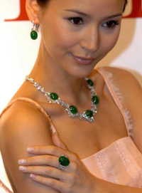 4月30日,模特在展示一套估價680萬到980萬港幣的翡翠蛋面鉆石首飾。當(dāng)日,香港佳士得拍賣行在香港舉行春季瑰麗珠寶及翡翠首飾拍賣品傳媒預(yù)展,拍賣會將于5月30日在香港會議展覽中心舉行。