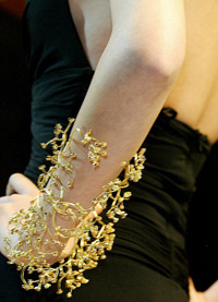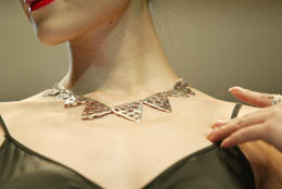 圖片說明:上海國際首飾時尚節(jié)上展出的珠寶首飾。依次為:蛇形鉑金手鐲、銀質項鏈、金制工藝手鐲和工藝項鏈。(本報資料照片) |