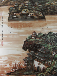 圖為《神州頌》局部、畫家苗重安創(chuàng)作的《龍門古渡》。 |