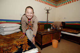 “家庭旅館”大多是由一個家庭騰出幾間客房來出租經(jīng)營的,游客可以與主人一起吃糌粑、喝酥油茶、聊家常。廣東的游客張女士說,拉薩的家庭旅館很有特色,住在這里可以更深刻地感受到西藏的特色!爱(dāng)然這里的價格比賓館酒店便宜也是其中一個原因!彼f。
