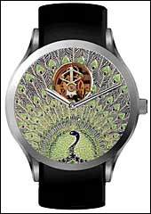 梵克雅寶腕表上的孔雀圖案最初出現(xiàn)于其1950年的百寶匣系列,表盤上的圖案是以特別的搪瓷技巧將孔雀的最美麗一面展現(xiàn)人前。工匠首先在金版上雕刻孔雀圖案的外形,再將其他空位挖空,造出圖案的輪廓。跟著,以搪瓷填滿被挖空的空位。一只色彩繽紛、栩栩如生的孔雀便活現(xiàn)于表盤上。