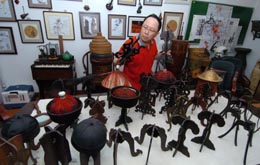 被稱為津門“帽子王”的王德強(qiáng)癡迷收藏古代冠架10多年,目前他收藏的明清兩代折疊式和壁式冠架達(dá)到200余架。據(jù)介紹,古人稱帽子為冠,大多為男人所用,冠也是男人尊嚴(yán)的象征不能隨便擺放。冠架一般是被放置在正廳的香案上的,如果來客見冠架上有男主人的帽子即可登門拜訪,如不見帽子即不方便做客,是人們?nèi)粘I钪胁豢扇鄙俚募揖。圖為王德強(qiáng)在展示收藏的部分明清兩代折疊式冠架。 |