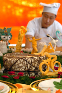 承擔(dān)北京2008年奧運(yùn)會(huì)接待任務(wù)的北京老字號(hào)名店“全聚德”日前在其舉行的“奧運(yùn)服務(wù)知識(shí)與技能競(jìng)賽”活動(dòng)中,推出創(chuàng)新面點(diǎn)和冷葷菜點(diǎn),并展示了將在奧運(yùn)期間提供給中外賓客的部分冷葷拼盤和面點(diǎn)樣本。圖為一名廚師在觀看用奶油蛋糕制成的奧運(yùn)場(chǎng)館“鳥巢”模型。 |