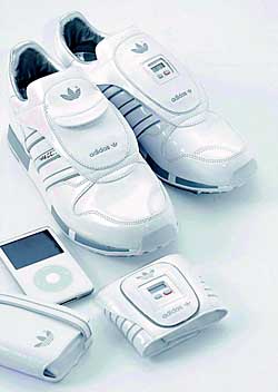 shuffle。 而大牌Nike也沒能抵擋住iPod的魅力,它與蘋果合作推出了NikePlus。Nike的老對手Adidas自然也不甘人后,以iPod為題材推出了iPod版Micropacer。Micropacer并非如NikePlus一樣得到蘋果技術(shù)性合作,而純粹是單方面借助iPod的概念。運用了iPod白、灰、銀三色做Micropacer配色,并以漆皮物料制作,鞋身設計模仿iPod反光玻璃膠面板效果。 |