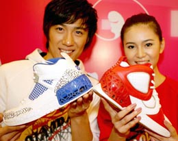 圖為模特在“第二屆中國(guó)運(yùn)動(dòng)裝設(shè)計(jì)大賽啟動(dòng)儀式”上展示具有北京奧運(yùn)元素的“鳥巢”和“水立方”的喬丹運(yùn)動(dòng)鞋。