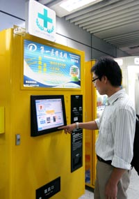 6月8日,一名市民在上海地鐵站內(nèi)的電子藥柜上購(gòu)買(mǎi)藥品。一段時(shí)間以來(lái),電子藥柜紛紛現(xiàn)身上海市的社區(qū)、商務(wù)樓、火車(chē)站、汽車(chē)站、地鐵等公共場(chǎng)所,電子藥柜內(nèi)存放著60余種常用非處方藥品和計(jì)生用品等,消費(fèi)者可查詢(xún)藥品的價(jià)格、批號(hào)、有效期等相關(guān)信息并自助購(gòu)買(mǎi),因其使用的方便快捷被市民稱(chēng)為“隨身藥箱”。 |