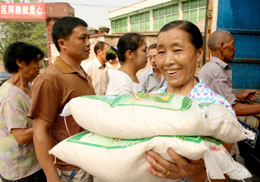 8月14日,四川省華鎣市永興鎮(zhèn)的災(zāi)民領(lǐng)取社會各界捐助的賑災(zāi)物資。當(dāng)日,由社會各界捐助的賑災(zāi)物資運(yùn)送到華鎣市永興鎮(zhèn),并發(fā)放到災(zāi)民手中。今年7月,華鎣山區(qū)遭受山洪和泥石流襲擊,公路被毀,田地、房屋被淹,群眾生產(chǎn)生活一度陷入困境。 |